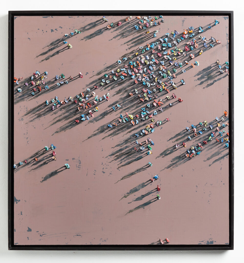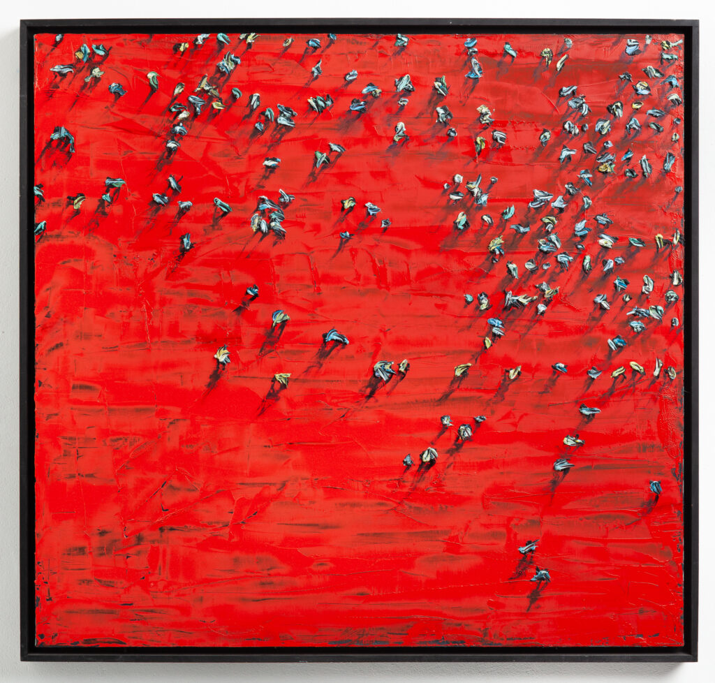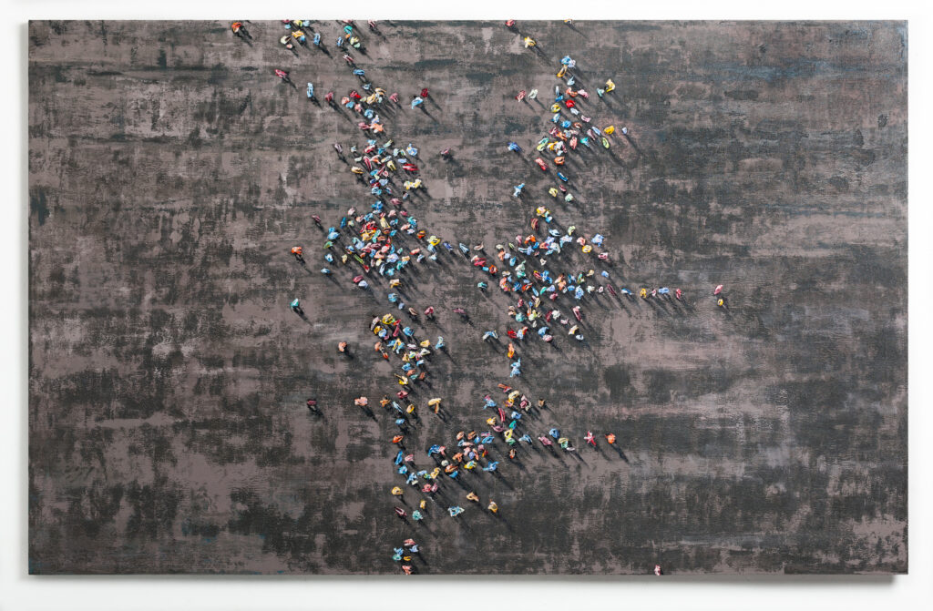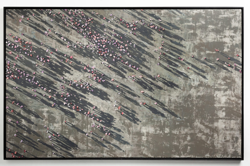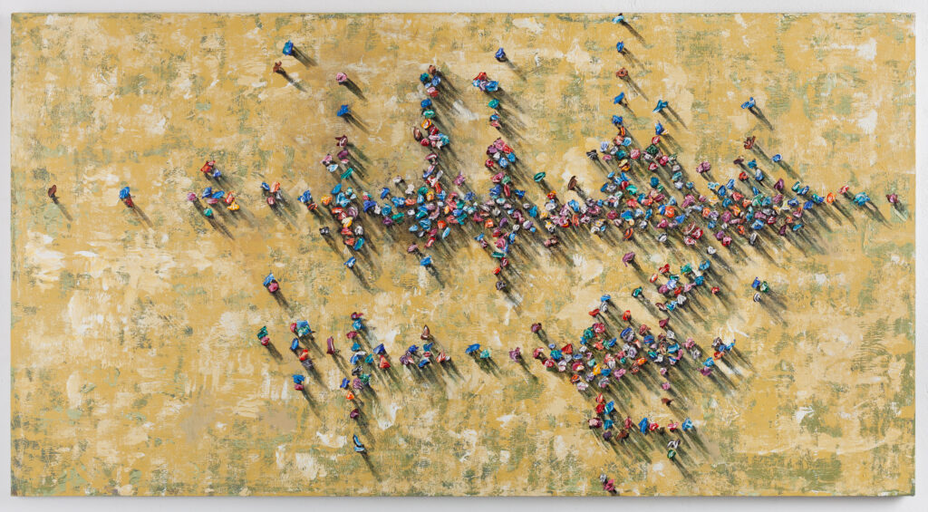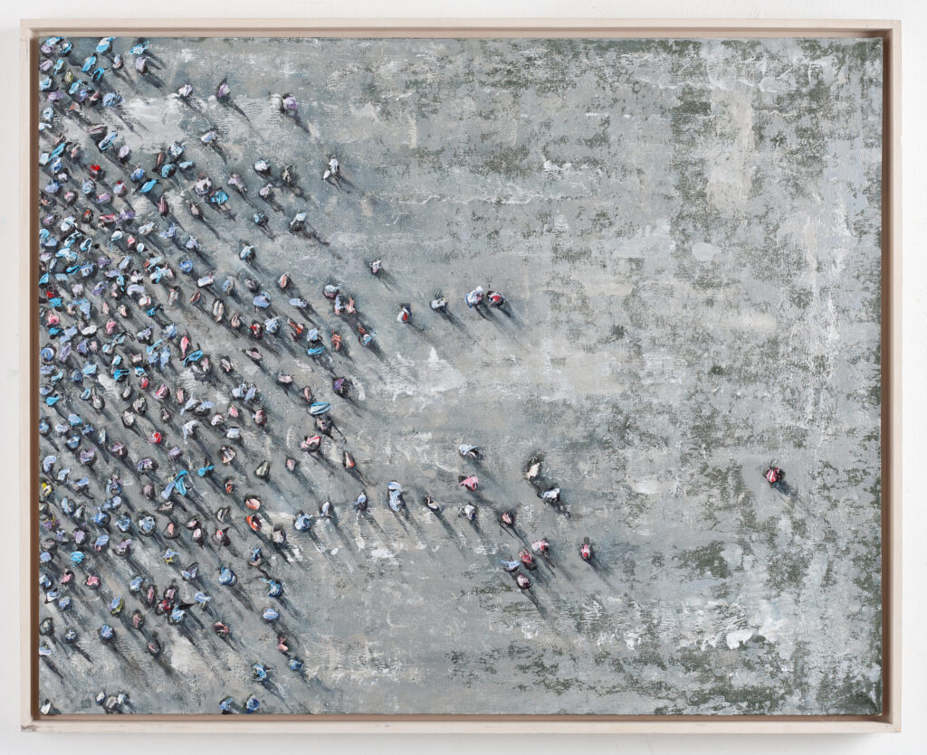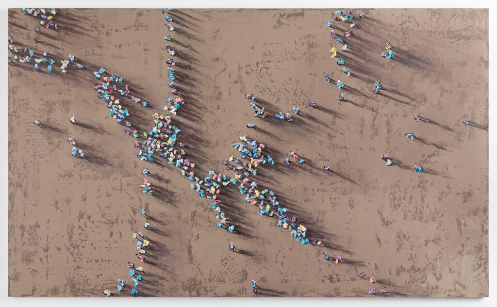 “neutral, patterned backgrounds, chaotic multitudes of anonymous characters and shadows”