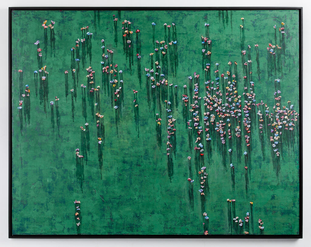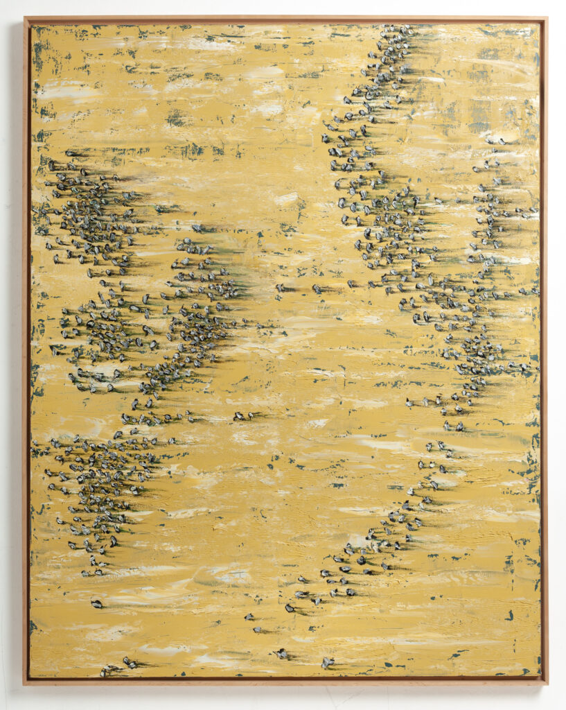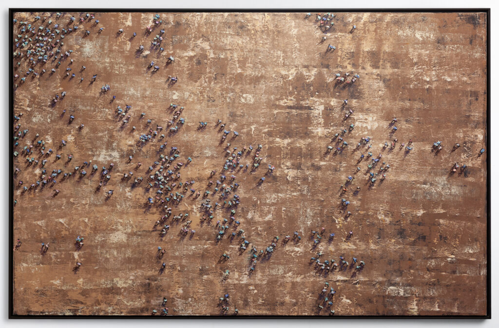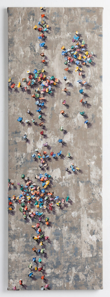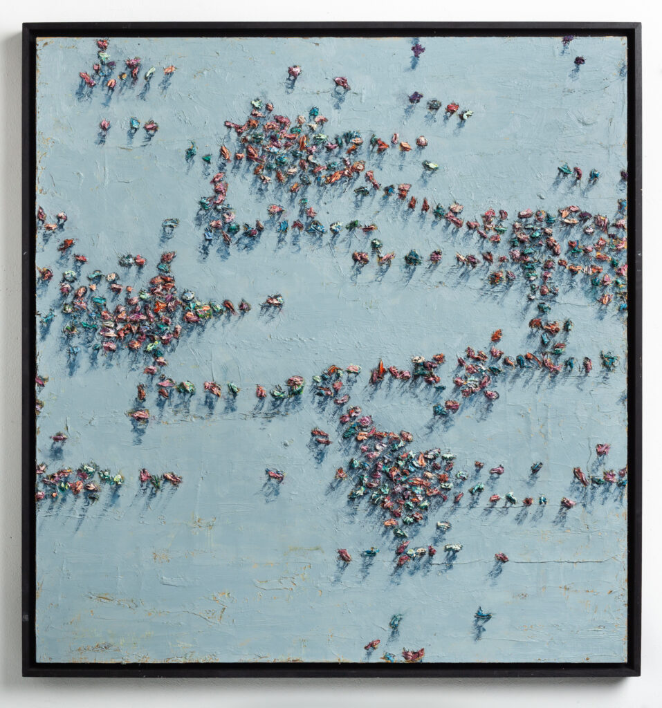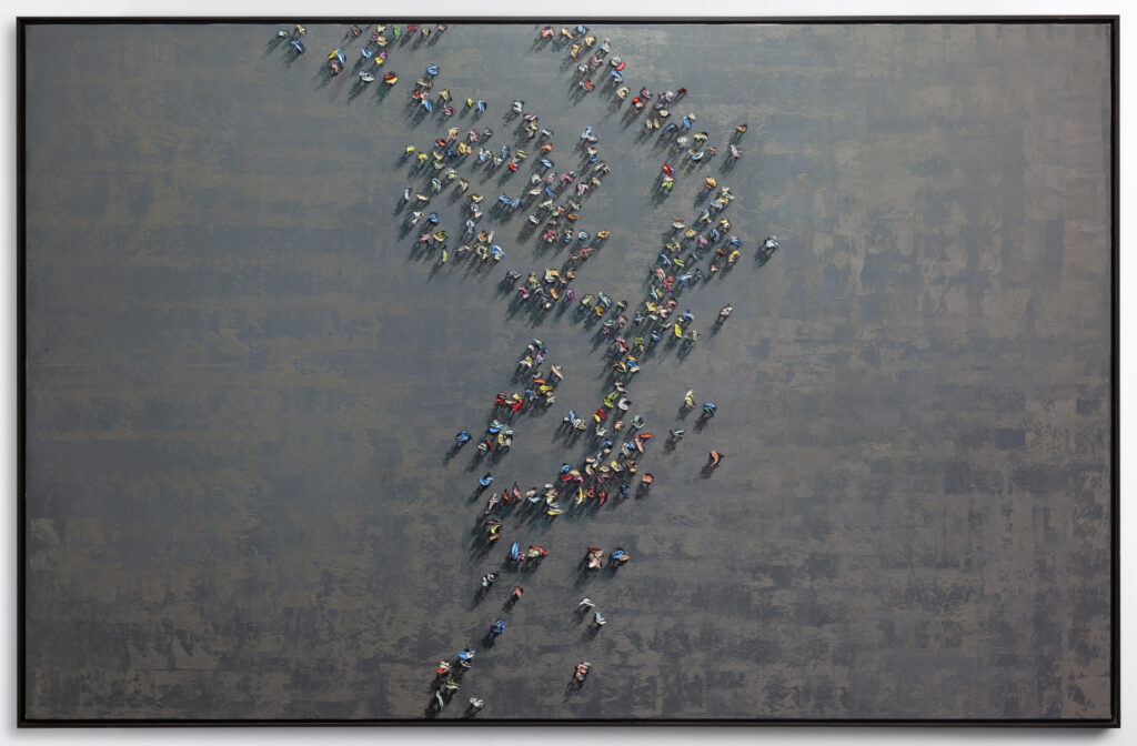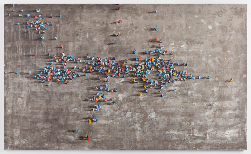 “neutral, patterned backgrounds, chaotic multitudes of anonymous characters and shadows”